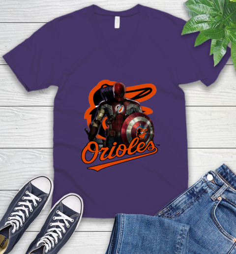 MLB Captain America Thor Spider Man Hawkeye Avengers Endgame Baseball Baltimore Orioles V-Neck T-Shirt