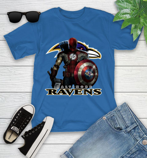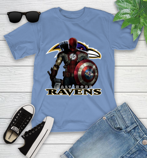 Custom NFL Captain America Thor Spider Man Hawkeye Avengers Endgame Football Baltimore Ravens Youth T-Shirt are the ultimate fan gear for those who love both football and the Marvel Cinematic Universe. These shirts blend the thrill of NFL action with the excitement of the final Avengers saga.
