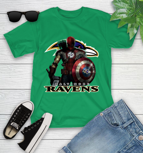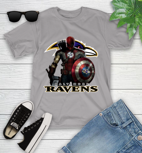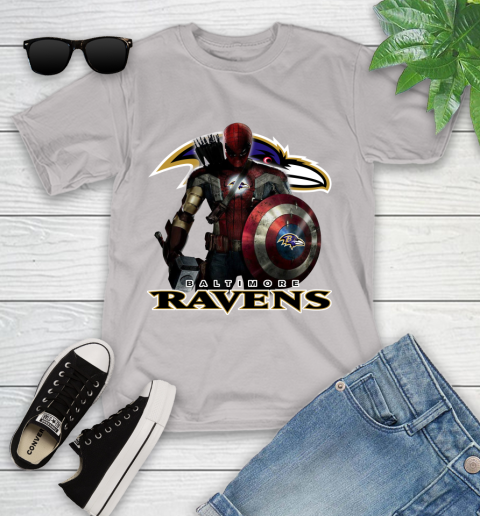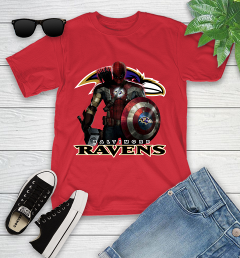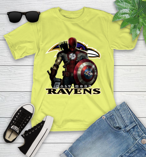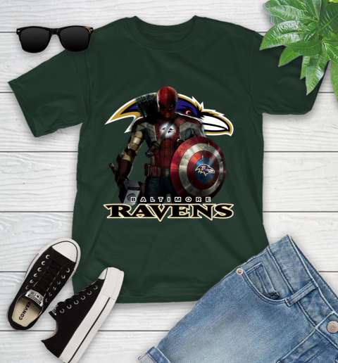 NFL Captain America Thor Spider Man Hawkeye Avengers Endgame Football Baltimore Ravens Youth T-Shirt