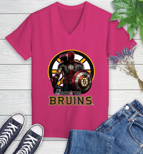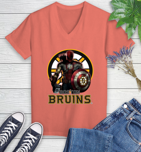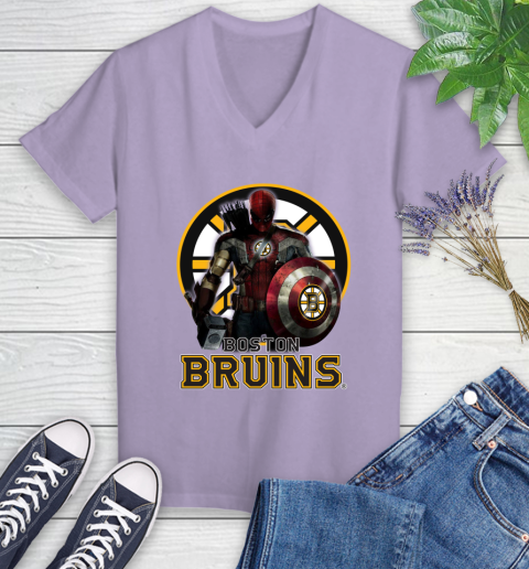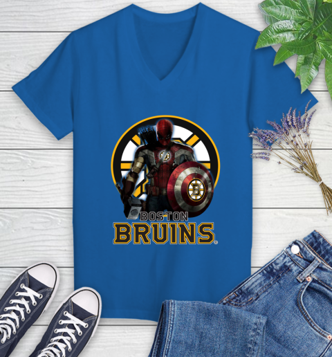 NHL Captain America Thor Spider Man Hawkeye Avengers Endgame Hockey Boston Bruins Women’s V-Neck T-Shirt