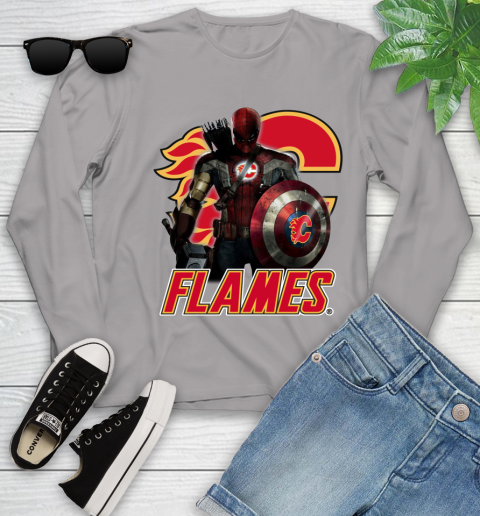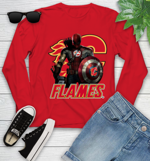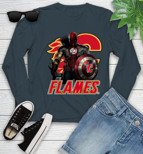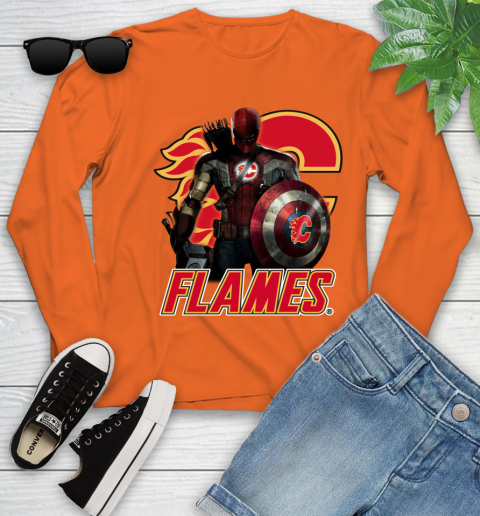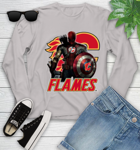 NHL Captain America Thor Spider Man Hawkeye Avengers Endgame Hockey Calgary Flames Youth Long Sleeve