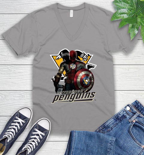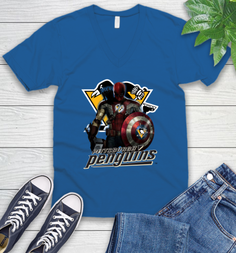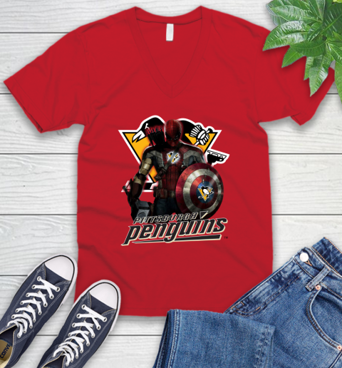 NHL Captain America Thor Spider Man Hawkeye Avengers Endgame Hockey Pittsburgh Penguins V-Neck T-Shirt