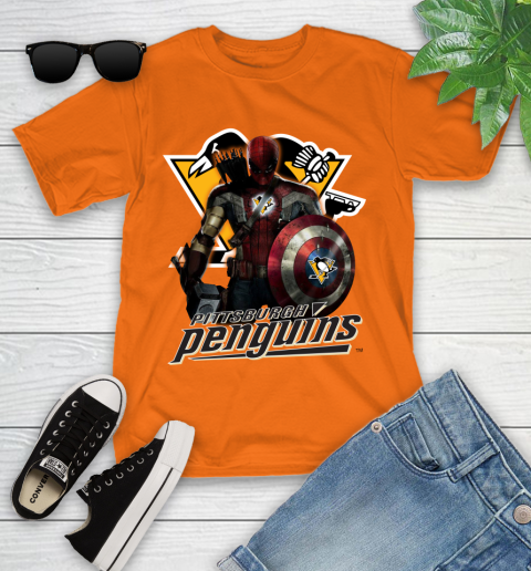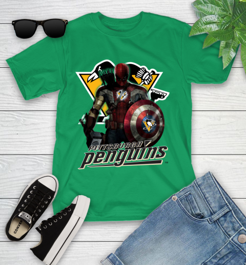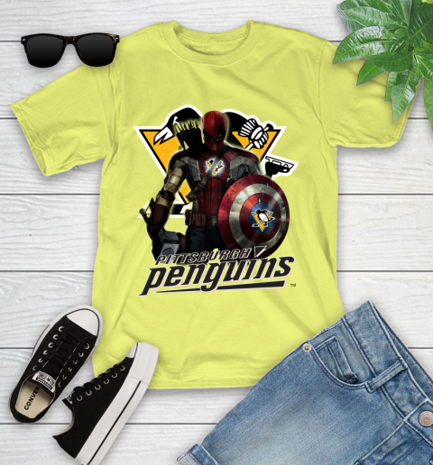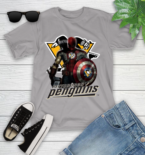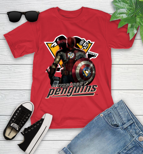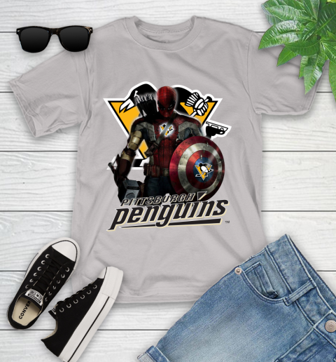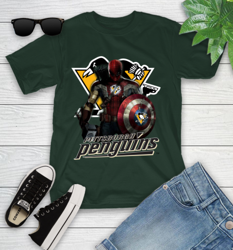 NHL Captain America Thor Spider Man Hawkeye Avengers Endgame Hockey Pittsburgh Penguins Youth T-Shirt