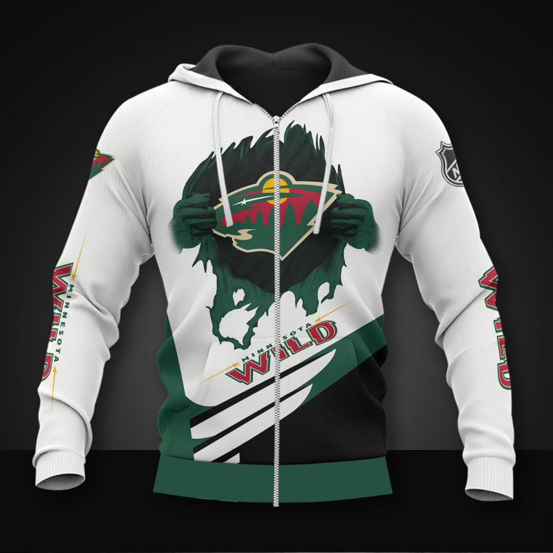 White Minnesota Wild Zipper Hoodies, Pullover Print 3D NHL are a great way to show your support for your favorite hockey team. Whether you’re at the game, at home watching on TV, or simply out and about, custom NHL jackets allow you to express your fandom in style. You can customize the design of your jacket with different colors and logos that represent your team.