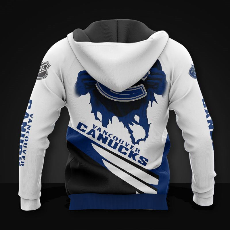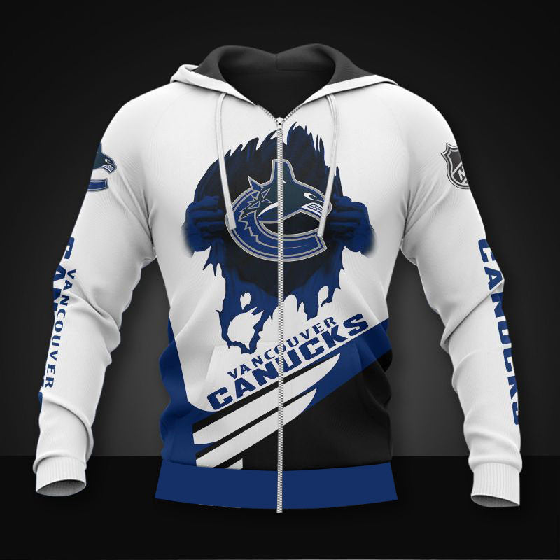 White Vancouver Canucks Zipper Hoodies, Pullover Print 3D NHL make it easy to show off your team spirit while staying warm and comfortable. Whether you’re a fan of the Montreal Canadiens, Toronto Maple Leafs, Vancouver Canucks, or any other hockey team, a custom NHL jacket can show everyone which team you support. Get yours today!